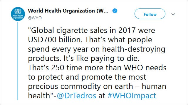 “In 2017 werd er 700 miljard dollar uitgegeven aan sigaretten,” zei dr. Tedros Adhanom Ghebreyesus, directeur van de Wereldgezondheidorganisatie (WHO), tijdens de conferentie WHO Impact. “Dat is 250 keer meer dan de WHO nodig heeft om het meest kostbare goed op aarde te beschermen en bevorderen: gezondheid.”