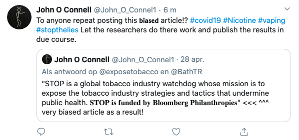 “De tabaksindustrie is bezig controverse en verwarring te zaaien over het risico van het gebruik van nicotine en tabaksproducten voor Covid-19.