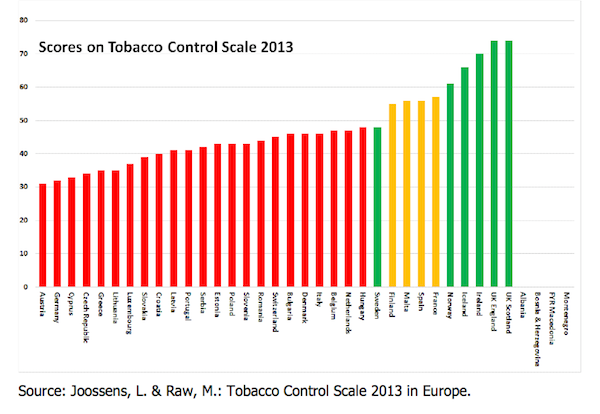 Staatje uit de Euro Health Consumer Index (p. 89) met in rood de landen die het slechtst scoren op zes indicatoren (prijs, rookverbod publieke ruimten, uitgaven aan informatiecampagnes, reclameverboden, gezondheidswaarschuwingen en behandeling). Zweden scoort op sommige van deze punten lager, maar is toch groen omdat het land de laagste prevalentie aan rokers heeft.